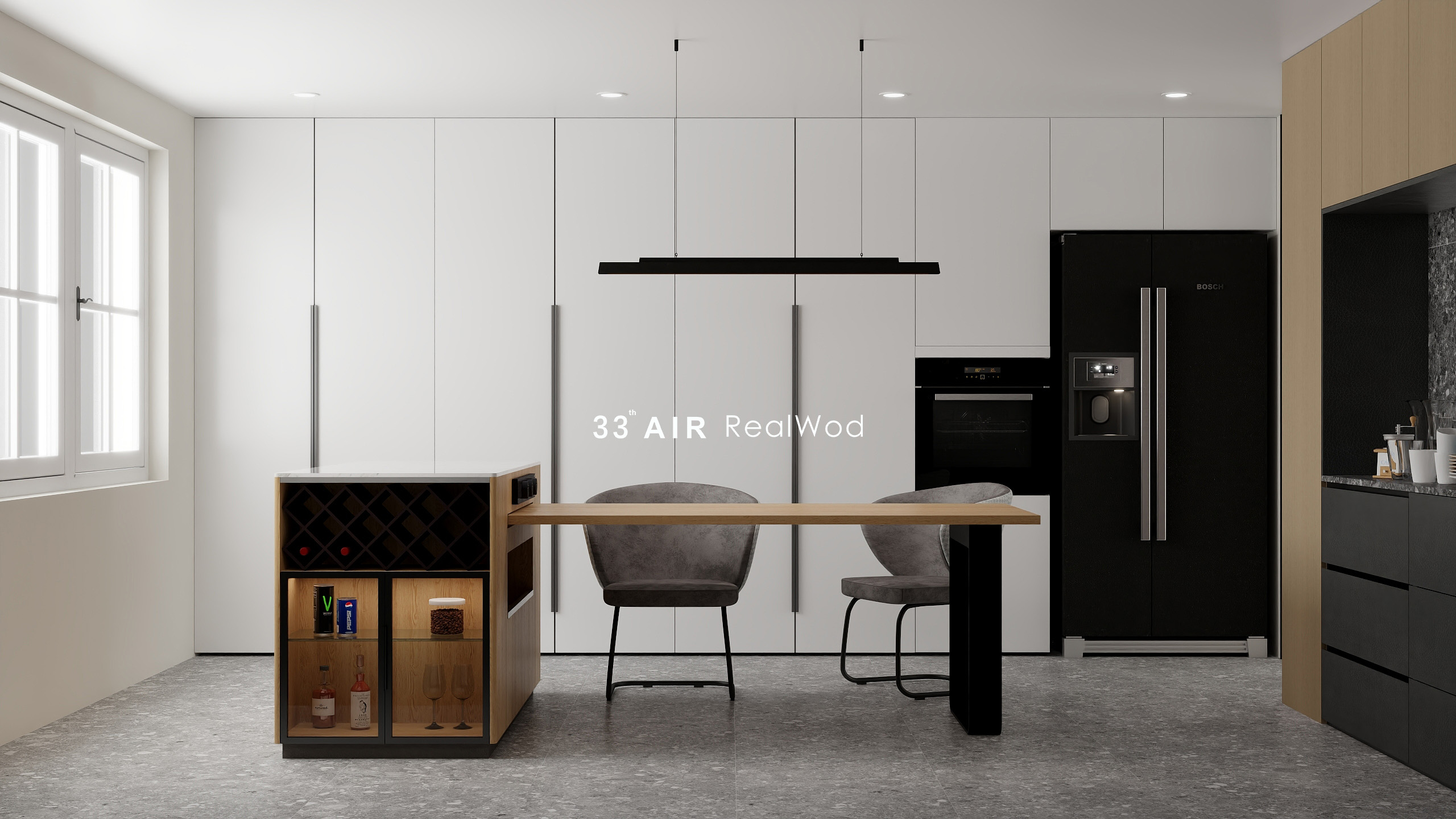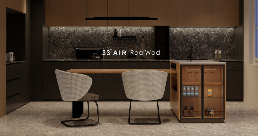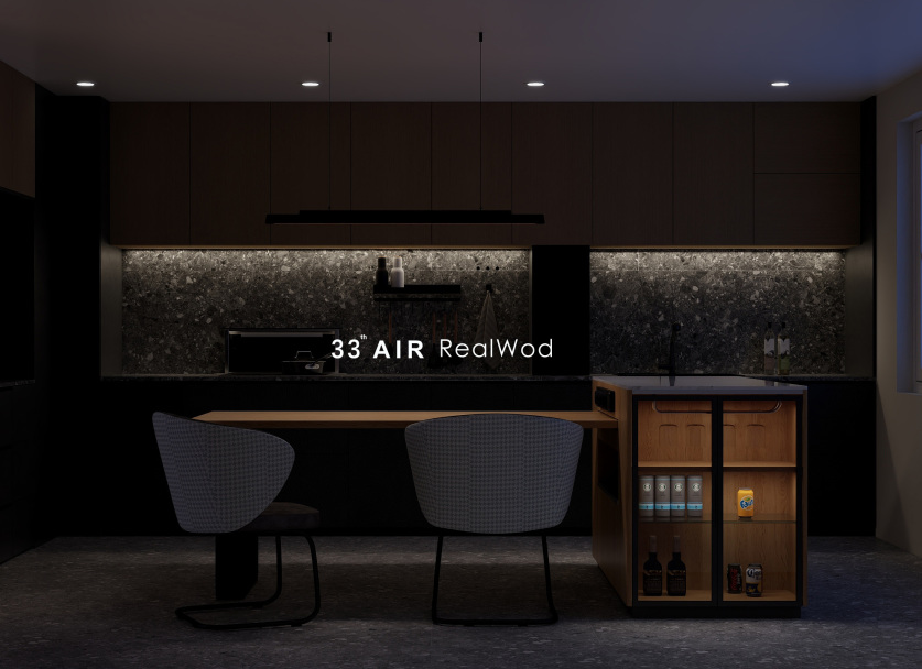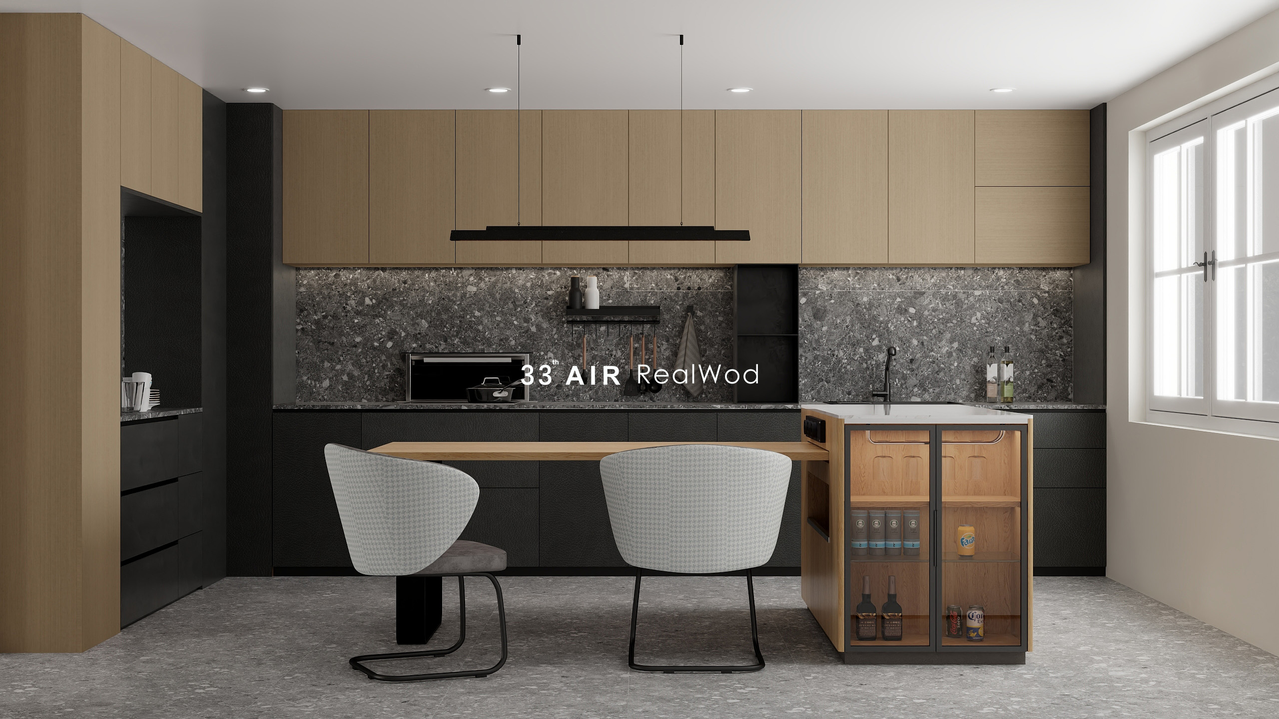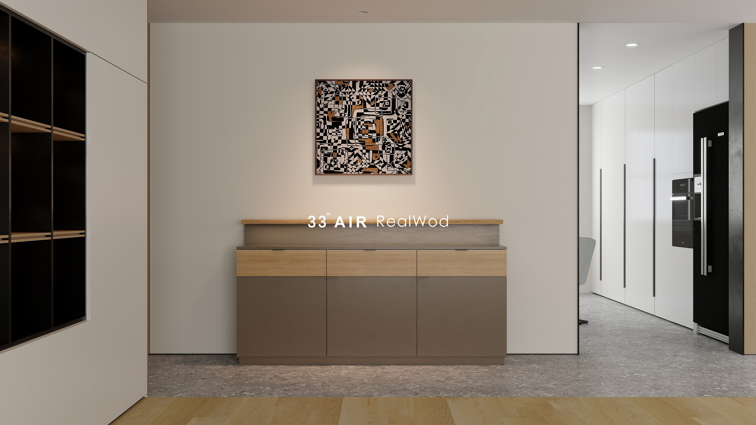 黑灰色的水磨石与原木色柜体组合